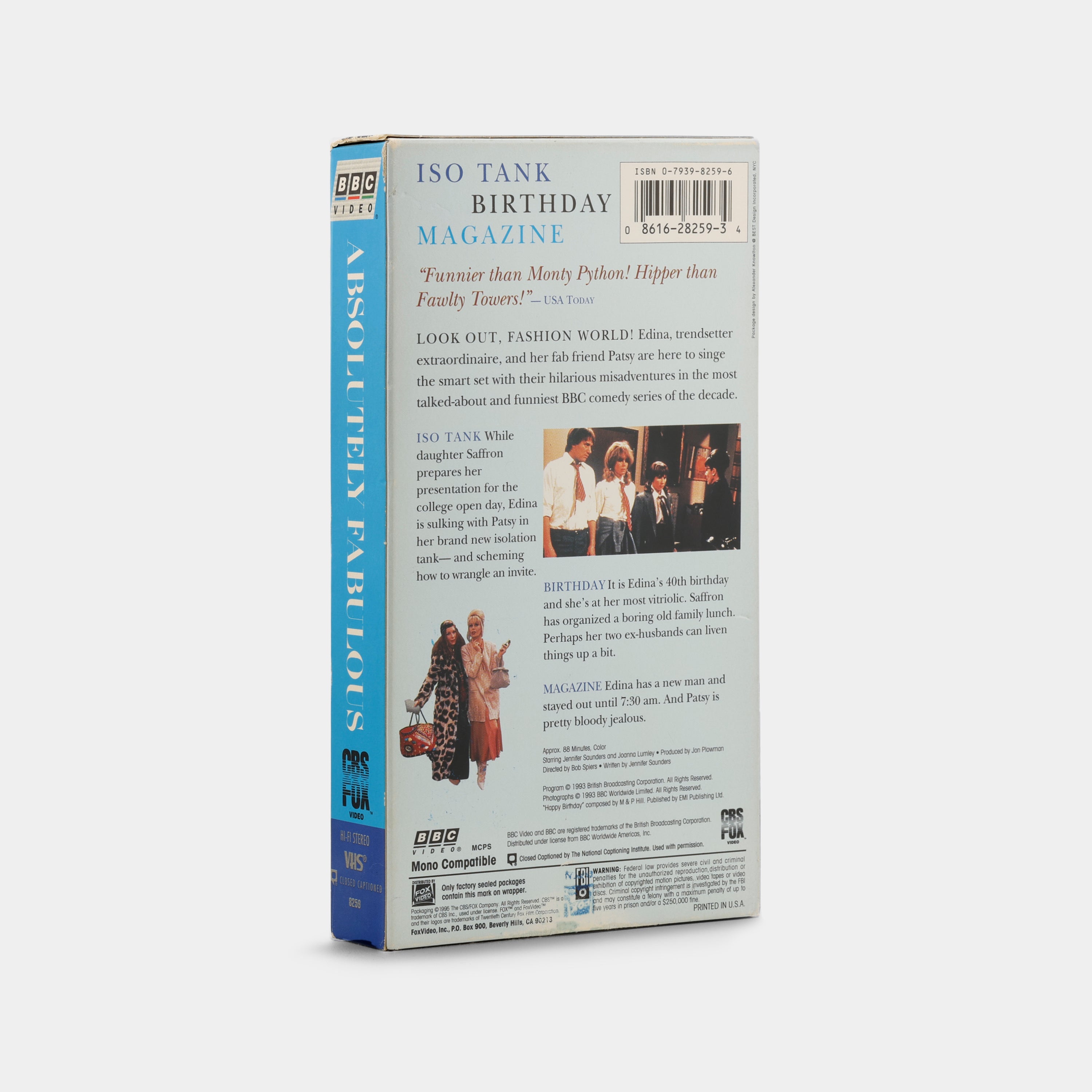 Absolutely Fabulous: Series 1, Part 2 (1993) is a VHS release containing three episodes from the British sitcom's first season: "Iso Tank," "Birthday," and "Magazine." Created by Jennifer Saunders, the series stars Saunders as Edina Monsoon and Joanna Lumley as Patsy Stone, chronicling the outrageous escapades of two fashion-obsessed women navigating London's high society. This release showcases the show's signature satirical humor and sharp commentary on contemporary culture.