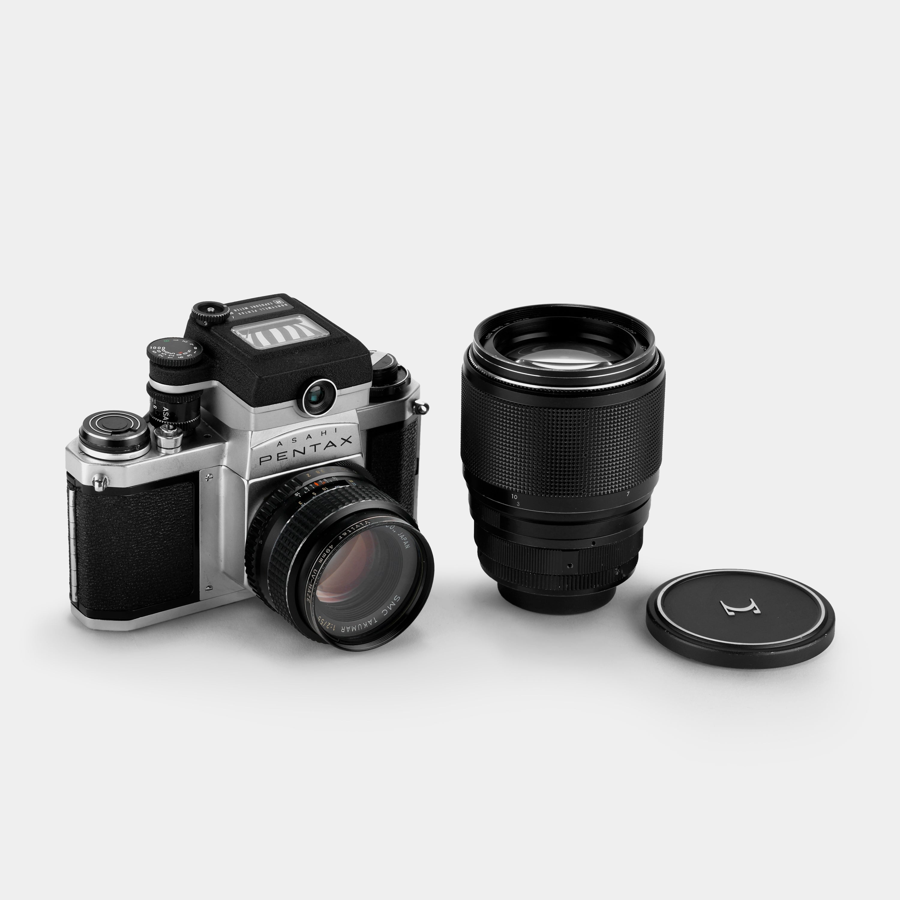 The Asahi Pentax SV is a classic 35mm SLR film camera known for its clean design, mechanical reliability and solid metal construction. Released in the early 1960s, it offers fully manual operation with a bright viewfinder and compatibility with M42 screw-mount lenses. This kit includes a sharp 55mm f/2.0 SMC Takumar lens and an additional 135mm f/2.8 Accura/Sigma telephoto lens—ideal for portraits or reaching a bit further. The SV doesn’t have a built-in light meter, but it comes with a detachable Pentax meter for added flexibility. With shutter speeds from 1 to 1/1000 second plus bulb mode, and ISO settings from 6 to 1600, this camera is made for those who appreciate simplicity, control and the tactile joy of analog photography.