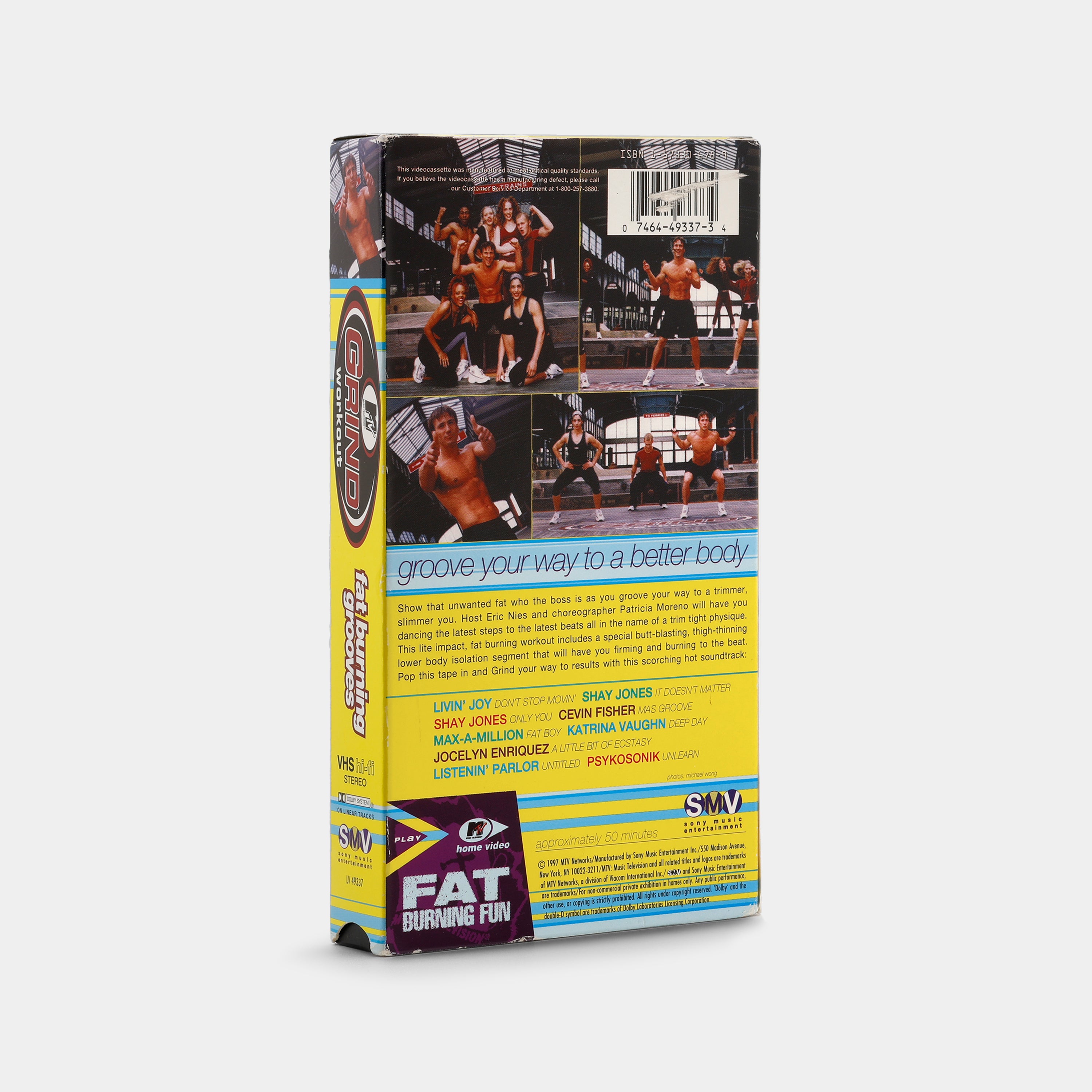 MTV Grind Workout: Fat Burning Grooves (1997) is a fitness VHS hosted by Eric Nies and choreographed by Patricia Moreno featuring a high-energy dance workout designed to trim and tone with lower body isolation and fat-burning cardio moves. With a soundtrack by artists like Livin' Joy and Jocelyn Enriquez, this tape promises an engaging workout experience.