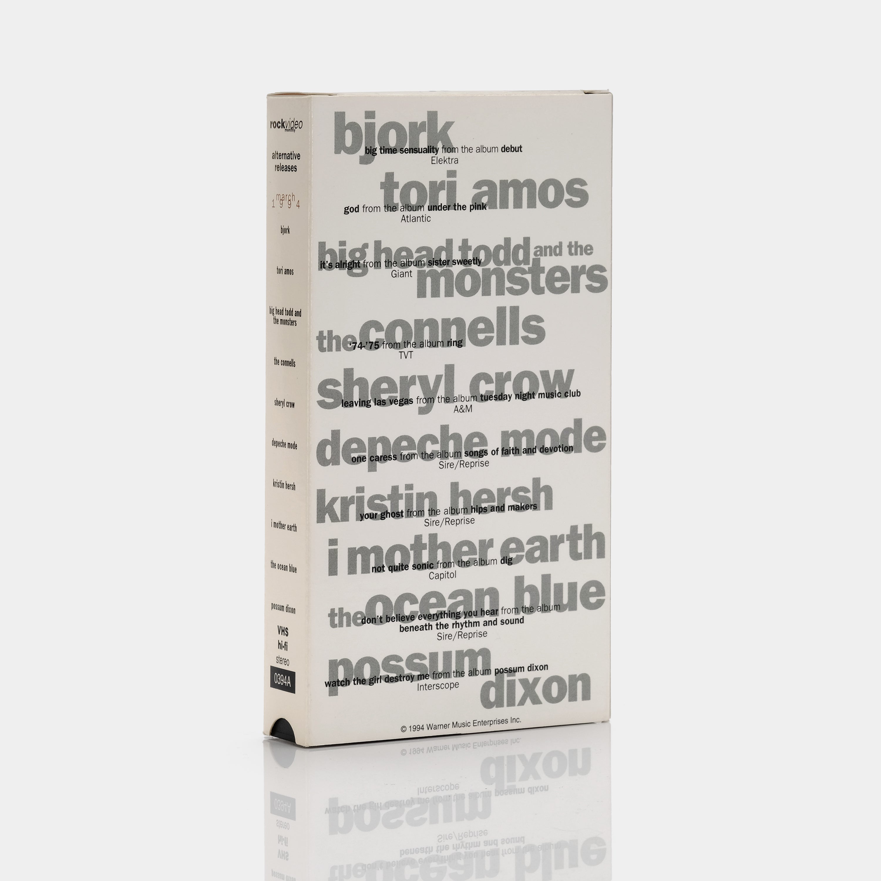 Rock Video Monthly: Alternative Releases (March 1994) features music videos from popular artists like Björk, Tori Amos, Big Head Todd and the Monsters, The Connells, Sheryl Crow, Depeche Mode, Kristin Hersh, I Mother Earth, The Ocean Blue and Possum Dixon. This collection includes tracks such as "Big Time Sensuality," "God," "It’s Alright," "74-75," "Leaving Las Vegas," "One Caress," "Your Ghost," "Not Quite Sonic," "Don’t Believe Everything You Hear" and "Watch the Girl Destroy Me." The video offers a mix of alternative, rock and indie hits.