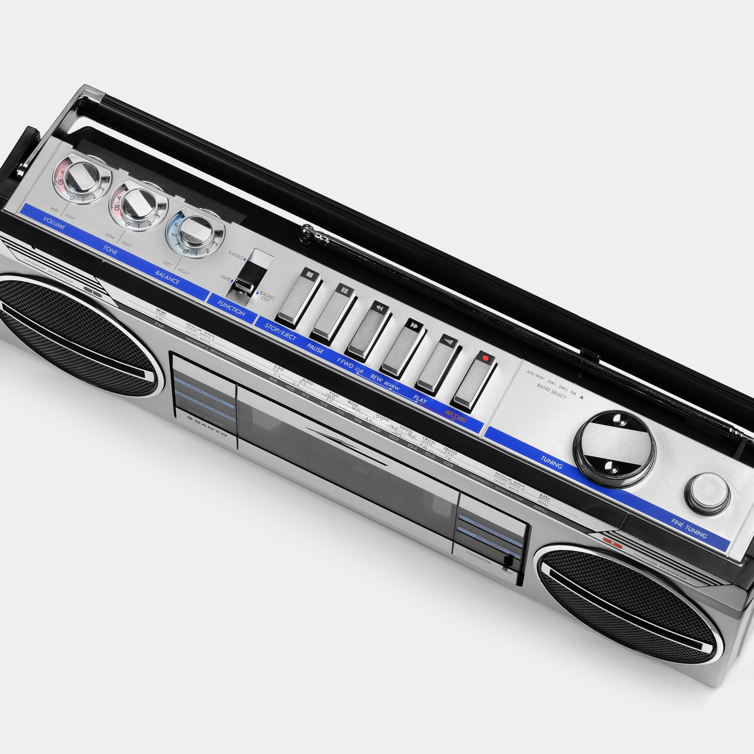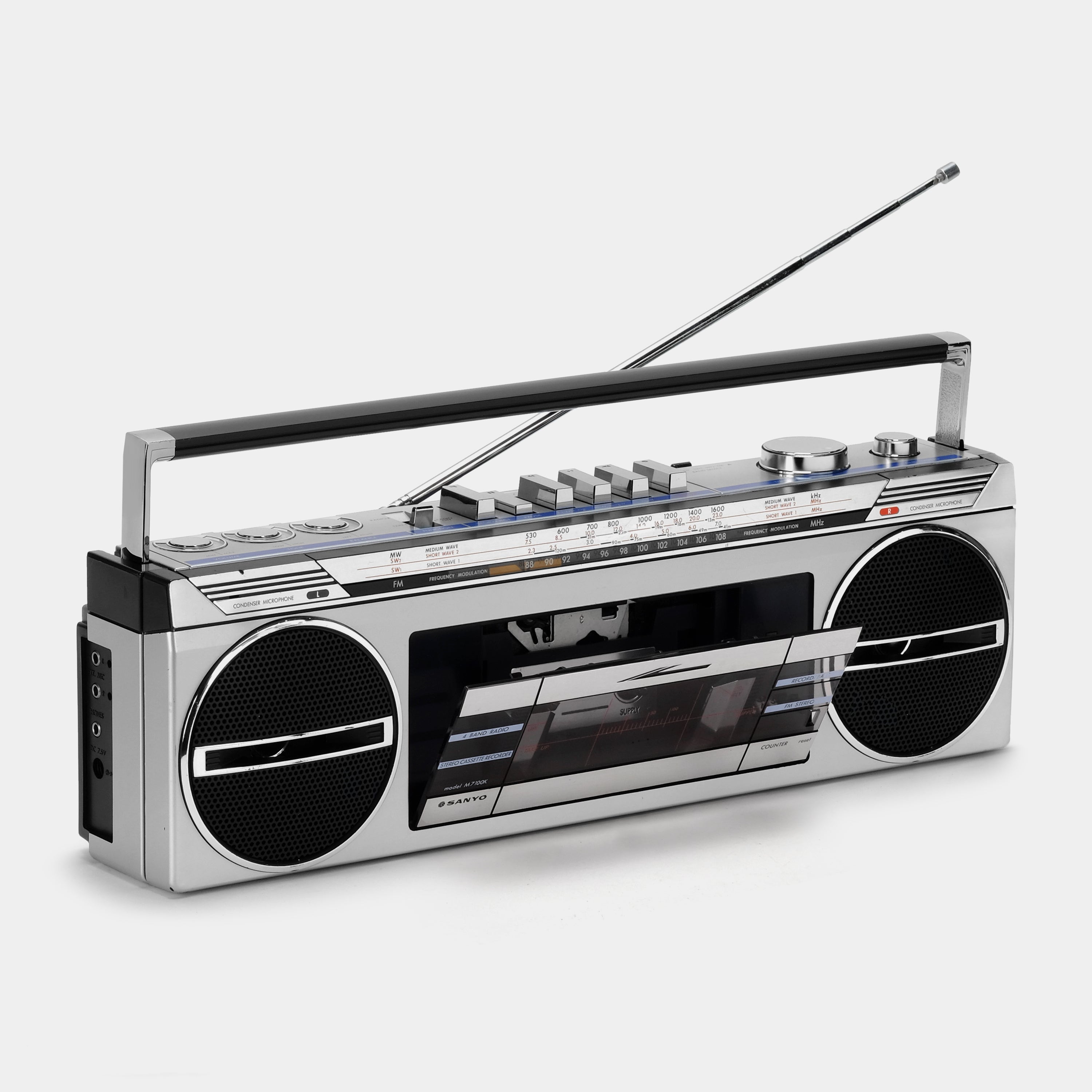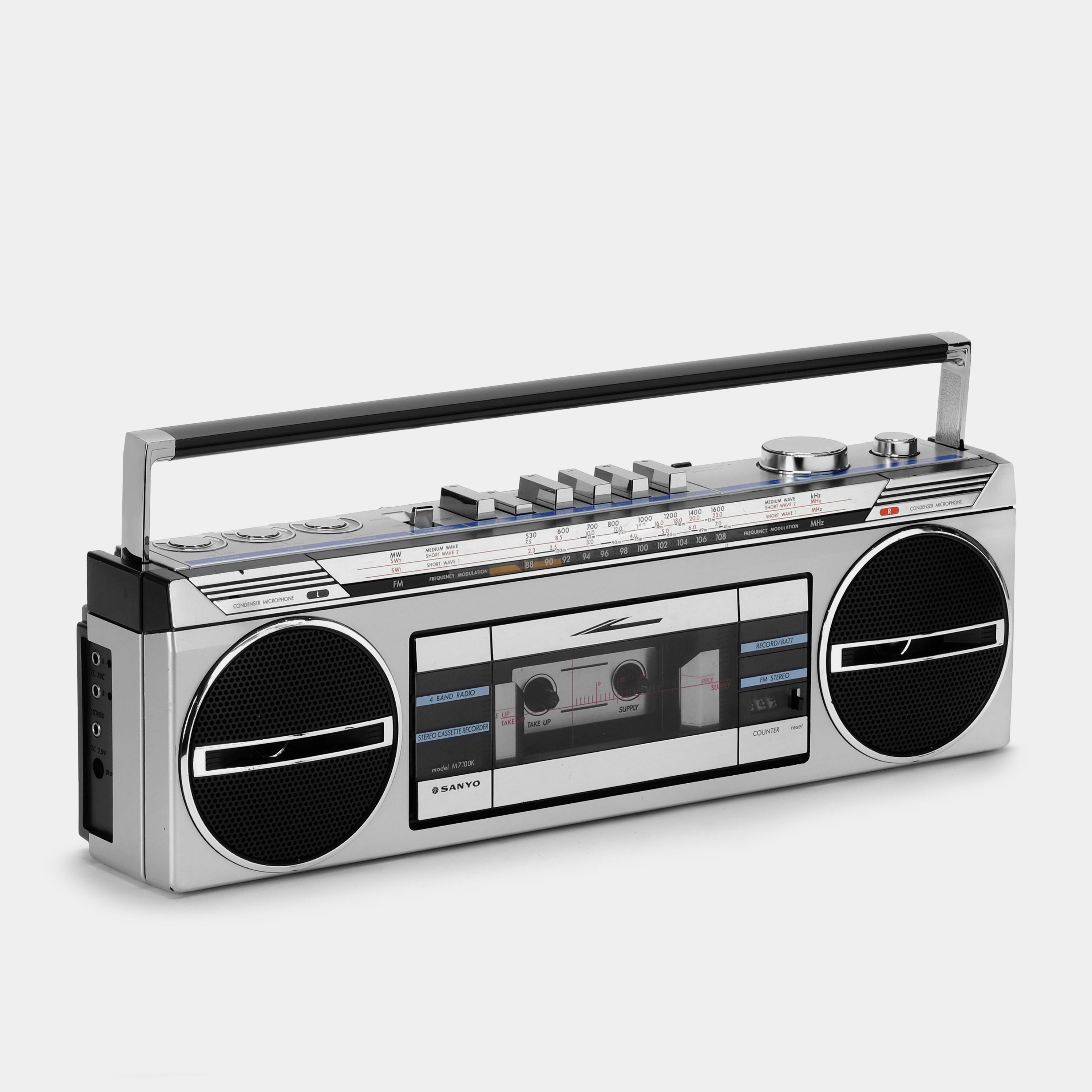 Check out this Sanyo M7100K boombox cassette player/recorder! Take a break from digital media and live in the moment. Record, fast-forward, rewind, flip the tape, watch it spin. Listen to an album all the way through and tune into your favorite radio station! Slow down and embrace the analog experience that is music on magnetic tape. Plus, record your own!