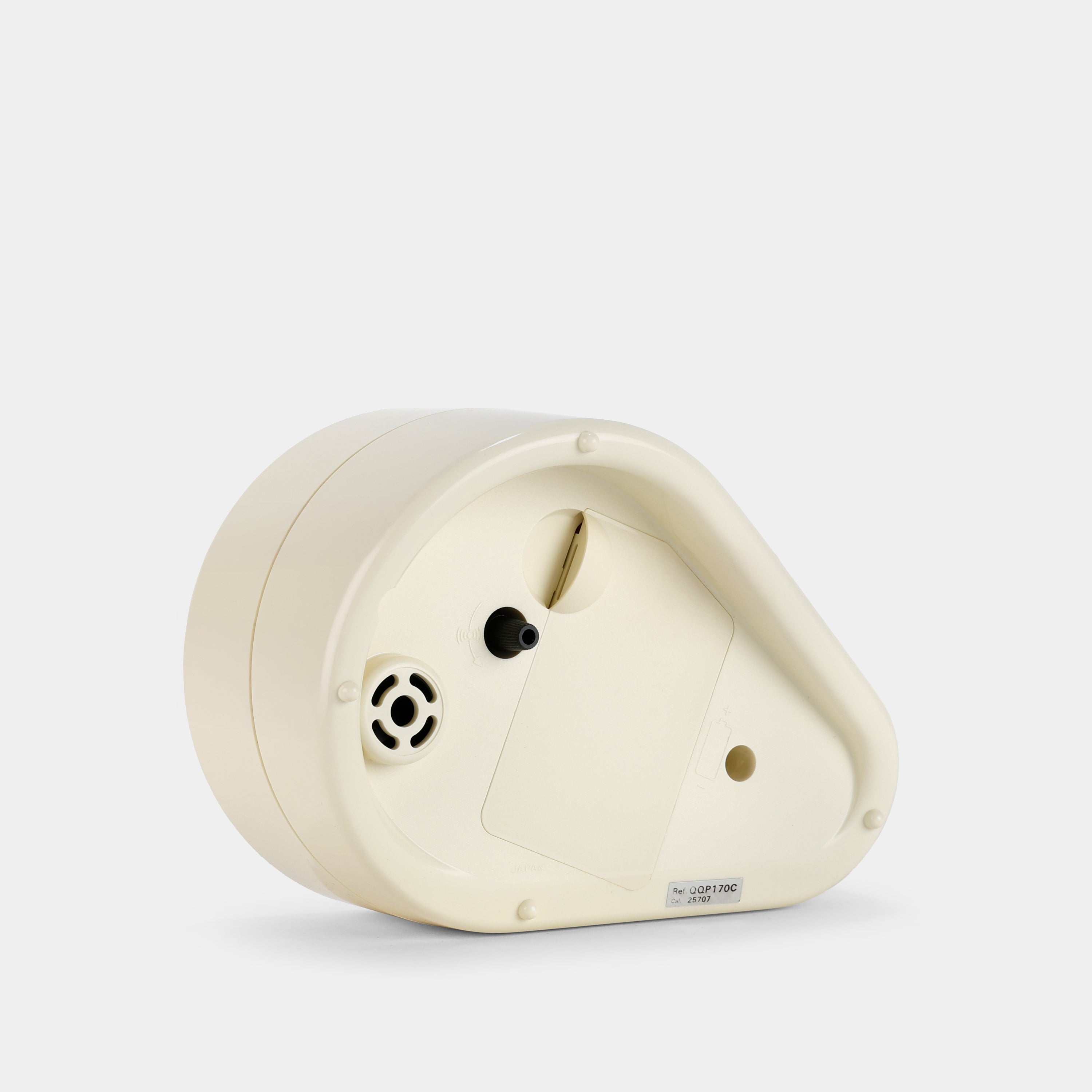 The Seiko Quartz Alarm Clock is a bold and playful timepiece featuring a distinctive retro-futuristic design. With its circular dial, oversized red center and asymmetrical cream-colored body, this clock doubles as both a functional bedside essential and a striking piece of mid-century-inspired decor. Powered by a reliable quartz movement, it includes a simple alarm function and tactile blue button for easy control. A rare find for collectors and fans of vintage design.
