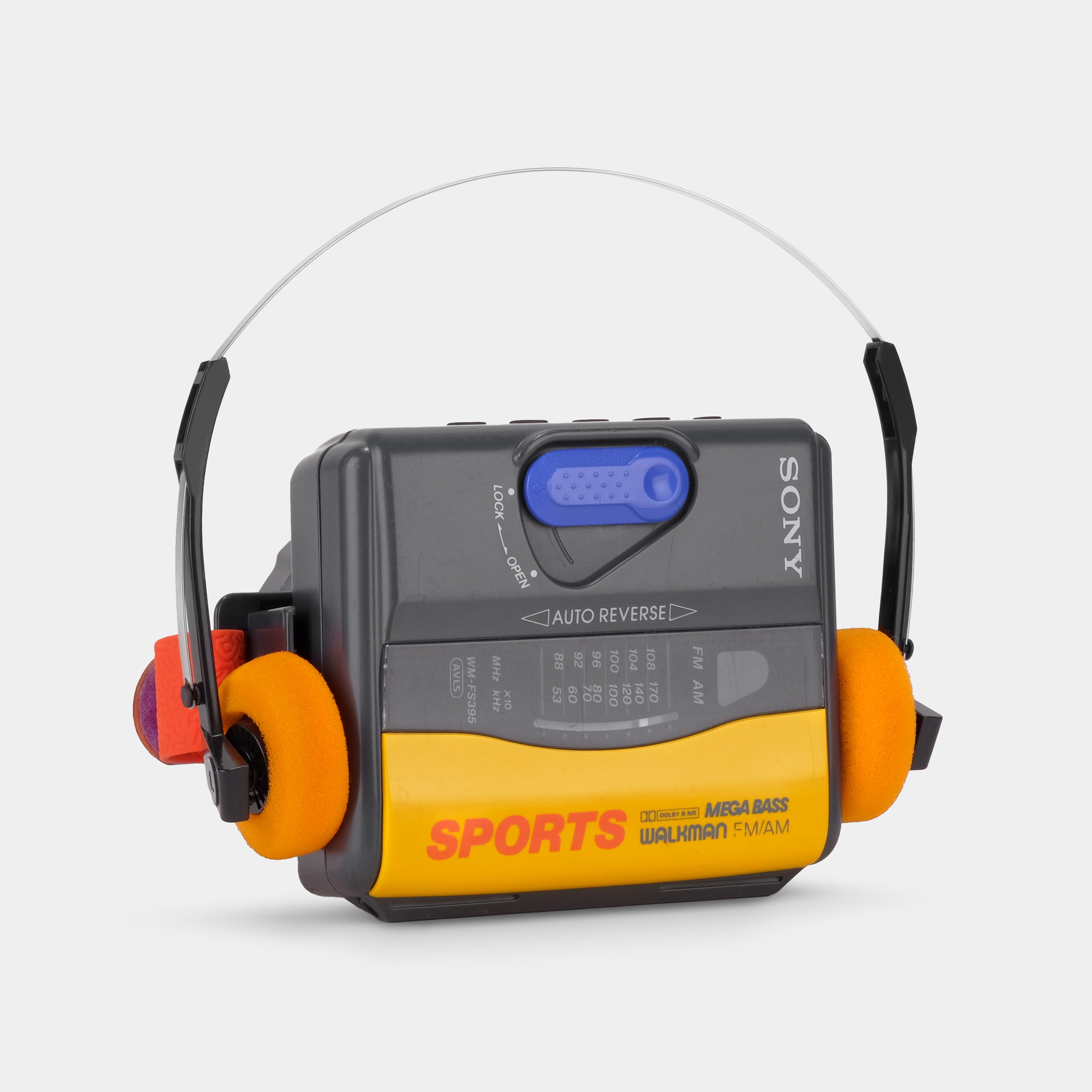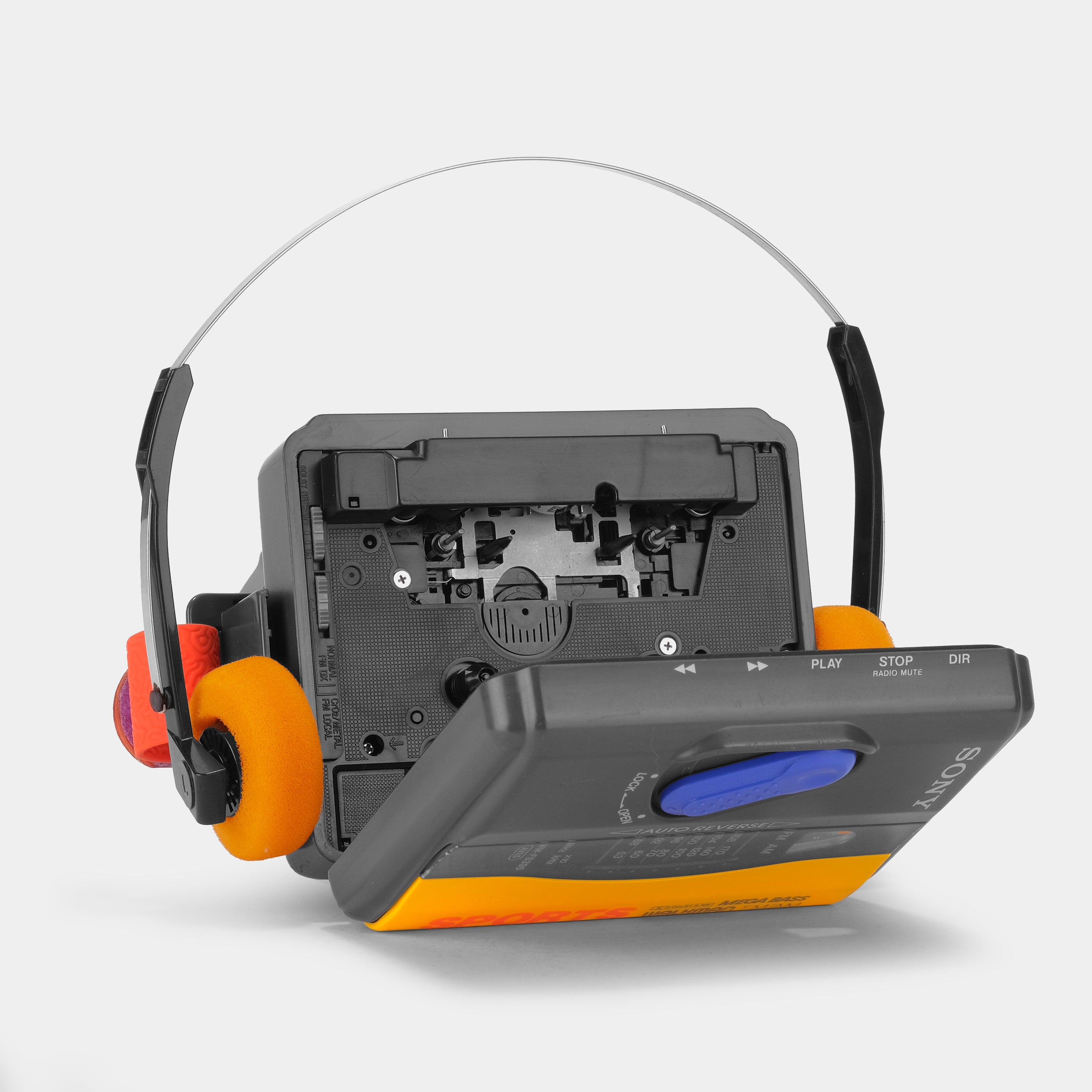 This is a yellow Sony Sports WM-FS395 Auto Reverse portable cassette player and retro orange headphones. Take a break from digital media and live in the moment. Fast-forward, rewind, flip the tape, watch it spin. Listen to an album all the way through. Slow down and embrace the analog experience that is music on magnetic tape.
