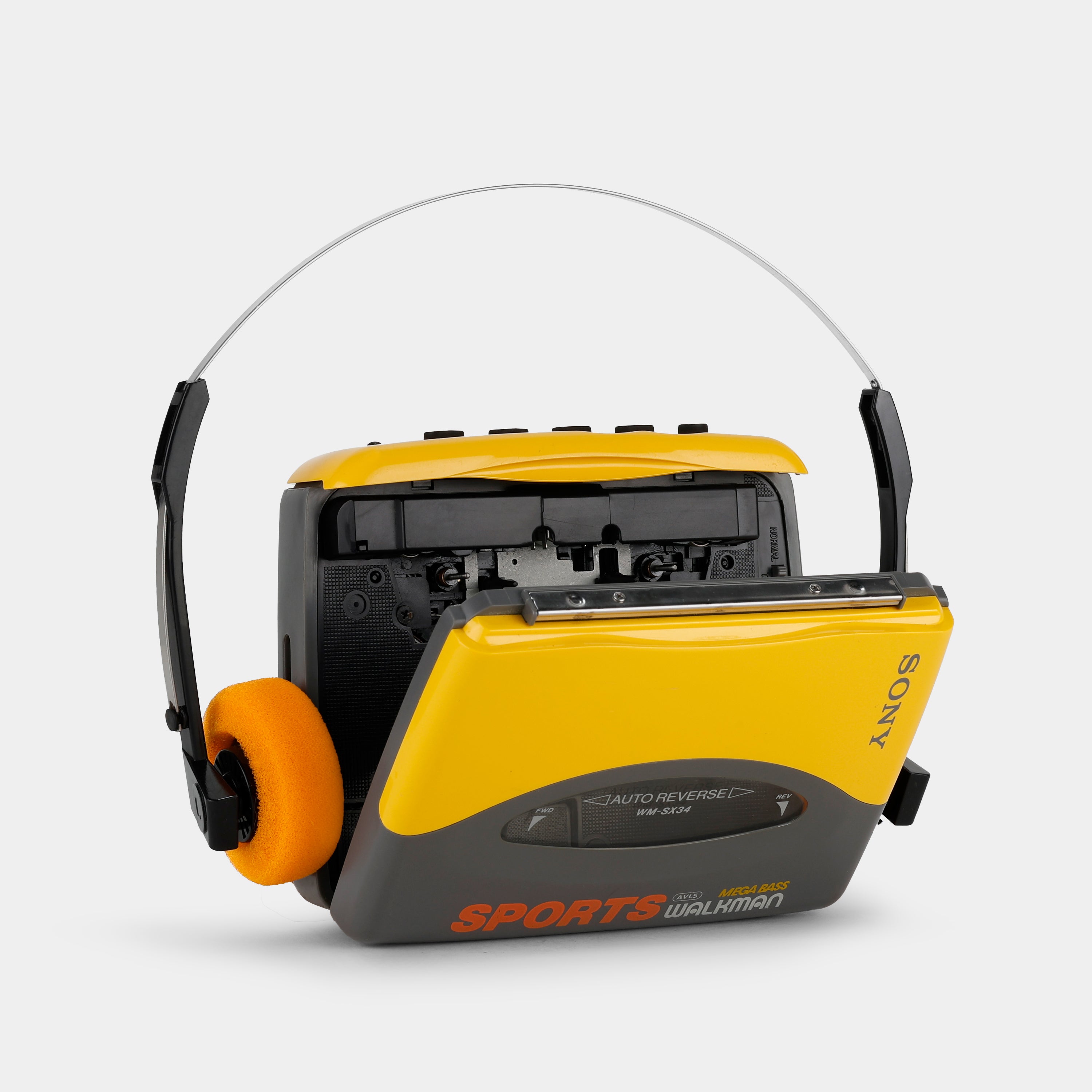 Released in the late 1990s, the refurbished Sony Sports Walkman WM-SX34 is a durable, weather-resistant portable cassette player. Part of Sony’s Sports series, it's designed for active use with a secure latch, rugged yellow body and sealed controls. It features analog tuning and stereo cassette playback. Auto reverse allows continuous listening, while Mega Bass enhances low-frequency sound.